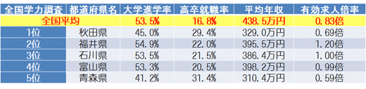 一方、学力1位の秋田県と5位の青森県はどうでしょうか。 不安定な労働環境とそれに伴う収入の低さが想像できます。 青森県民の平均年収は全国一低い沖縄県とほぼ同水準です。