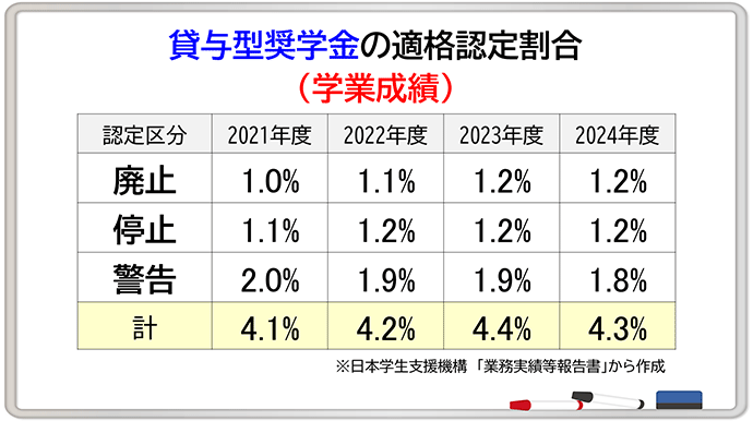 貸与型奨学金の学業成績での適格認定状況をみると、毎年1%程度が「廃止」または「停止」、2%程度が「警告」処置を受けていることがわかります。 あたり前の話ですが、奨学金の支給が止められると、その後の学業の継続に深刻な影響を与えかねません。