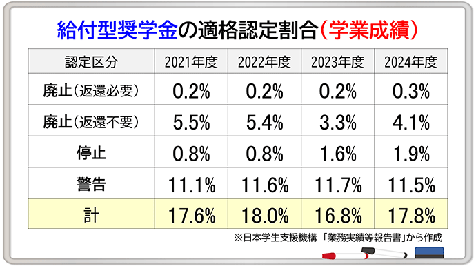 適格認定では、主に「学業成績」「経済状況」の観点から審査され、「継続」「警告」「停止」「廃止」の4つの結果が通知されることになっています。