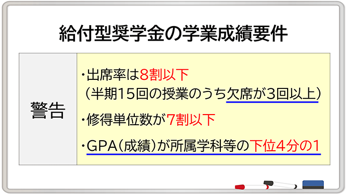 | 2 | 「警告」奨学金の支給が継続されるが、成績向上しなければ停止のおそれがある |