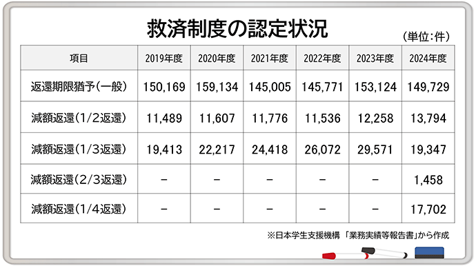日本学生支援機構では、「業務実績等報告書」として毎年各年度の取り組みや結果詳細を公表しています。当報告書のなかから、救済制度の新規適用件数の推移を見てみます。