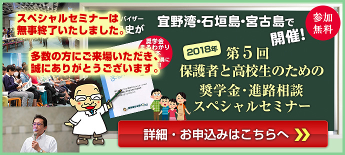 | 沿革 | いくつかの偶然が重なり、沖縄の出版社との共同事業で2004年に沖縄の立場に特化した進学情報誌の出版に関わる。 その過程で奨学金をはじめとする進学費用情報の必要性を実感し、奨学金アドバイザーとして高校内での保護者対象講演活動を開始。 その後、高校だけでなく大学、専門学校のオープンキャンパスや全国各地で開催される進学相談会での講演依頼が増え、現在では年間100回以上の講演を行う。 2009年には奨学金を分かりやすく解説したホームページ「奨学金なるほど!相談所」を開設。全国から年間300件以上の相談が寄せられている。 2014年からは、受験生の保護者を対象にした「奨学金スペシャルセミナー」を沖縄県内で開催。毎年2000名以上の親子が来場する規模となっている。 2016年から、薬学生・若手薬剤師向けの奨学金返済セミナーを実施。 2019年、青森県でも「奨学金スペシャルセミナー」を開催。 |